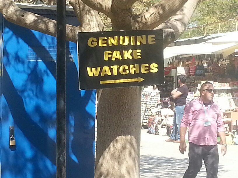 The sign, as you can see to your right, simply said, ‘Genuine Fake Watches’. I read the three words repeatedly to assure myself that I was seeing what I thought I was seeing. “Is this a grand example of full disclosure, or what?” I thought. They were not only telling us their stuff was phony, but subtly warning us that even their phony stuff had knockoffs! What a blessing. They were trying to save us the embarrassment of ending up with a fake that was less than genuine. Well, they clearly owned the moral high-ground here. It was a sobering moment, though. What’s the world coming to when there are frauds out there who can’t be trusted to be honest about the true extent of their lack of quality? Thank God for frauds that announce to the world that their fakes are “genuine”.