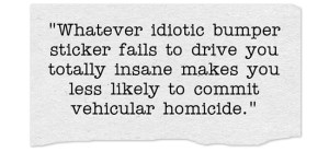 l equilibrium caused by somebody’s bumper sticker. The ‘bumper sticker version’ of that old adage, ‘Whatever doesn’t kill you makes you stronger’ is, ‘Whatever idiotic bumper sticker fails to drive you totally insane makes you less likely to commit vehicular homicide’. Bumper stickers are like mosquitos at a barbecue; they attack without warning, and by the time you realize that you’ve been penetrated, it’s too late.