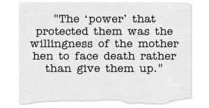 d whatever predator might threaten them. The ‘power’ that protected them was the willingness of the mother hen to face death rather than give them up.