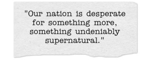 brokenness as the lame man’s legs were to hold him up. Our nation is desperate for something more, something undeniably supernatural, and this much is certain. It won’t unfold because of our academic superiority or our extensive ministerial training. Mimicking the gurus of corporate leadership or applying political leverage won’t help, and clever antics in cyberspace can’t make it happen. Supernatural effects demand a supernatural cause.