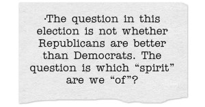 The question is which “spirit” are we “of”? Candidates who promote the slaughter of innocent unborn babies challenge us, and the issue is lives, not politics. Political “Goliaths” who advocate philosophies and policies that undermine God’s design for families and relationships stand up to mock us. Giants who would force acceptance of lifestyles and behaviors that clearly violate God’s principles are taunting us. These issues are not just political. They are expressions of the combatants in a spiritual war.
