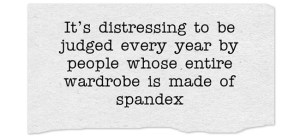 It’s distressing to be judged every year by people whose entire wardrobe is made of spandex and who live in houses where every piece of furniture is equipped with pedals and weighted pull handles. How can we compete with people who show up at weddings and funerals dressed in leotards and bare-midriff tank tops with matching sweat bands, and whose main purpose in life, when they’re not pumping or pulling on something, is to stroll around casually flexing their muscles and sipping on protein smoothies made of organic kumquats, eucalyptus bark, fish oil, and porcupine saliva.