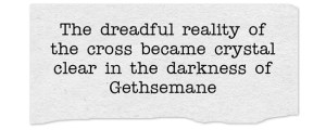 The dreadful reality of the cross became crystal clear in the darkness of Gethsemane and though He agonized over what lay ahead, He refused to avert it. He suffered every