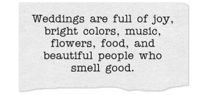 - “Weddings are full of joy, bright colors, music, flowers, food, and beautiful people who ‘smell good.'” @GallaghersPen (Click to Tweet)