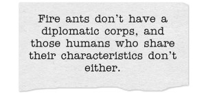 ideological and philosophical “species.” Similar responses are displayed by their cohorts in the world of politics, news, and entertainment. When their protective perimeter is penetrated by an unapproved idea or practice, they collectively seek to overwhelm and subdue the intruder. They lock on with their social media “jaws,” and immediately begin to inject as much venom as they can generate until the threat has been removed. Fire ants don’t have a diplomatic corps, and those humans who adopt their characteristics don’t either. There’s neither serious negotiation nor opportunity for honest debate. “Search and destroy” is their strategic mission, and their objective is to preserve and expand the colony at all costs.