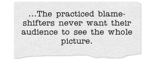 practiced blame-shifters never want their audience to see the whole picture. They use lies and deceit to divert any negative attention away from themselves and toward their victims, a tactic designed to protect their public persona from the truth and incite others to join in, amplifying the unjustified accusations and misplaced outrage.