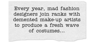 designers join ranks with demented make-up artists to produce a fresh wave of costumes depicting a multi-faceted view of death. There’s near-death, post-death, and sort-of (but not quite) dead, plus death that comes and goes. And lest we seem insensitive, efforts are made to acknowledge that monsters have nutritional needs, too. Therefore, among the undead, mostly dead, and occasionally dead, we have blood suckers, brain eaters, and an assortment of garden variety carnivores.