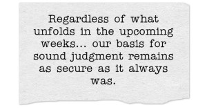 promise of His presence. Regardless of what unfolds in the upcoming weeks, in those incredible gifts, our basis for sound judgment remains as secure as it always was. The question, then, is not what scheme was conspired by whom to do what, but rather, what do we have that is real, what do we know that is true, what do we have that will last, and to whom do we owe everything? If we have those issues settled, then we can move ahead and make the choices that God directs with courage and confidence.