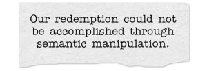 something tolerable, much less “right.” It will remain as hopelessly wrong 10,000 years from now as it was on the day it was done. If God the Father could have erased the problem of sin by simply reclassifying wrong things as right, then allowing (much less requiring) the torture and death of Jesus would have been the most incomprehensibly unjust act ever perpetrated. Our redemption could not be accomplished through semantic manipulation.