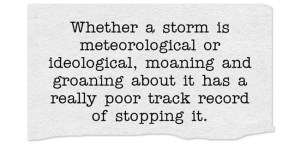 When we get news that a severe storm is headed our way, most of us don’t decide that the thing to do is to gather in a group and condemn the weather patterns that facilitated it. Neither do we call our friends and neighbors and plan a series of meetings to reminisce about how great it was when the sun was shining and there were no threatening storm clouds in sight. When the weather satellites reveal the size of the storm and its potential for devastating impact, we don’t generally tend to break out the antidepressants, retreat to our bedrooms and hope we aren’t killed by falling debris. Most of us still believe that God has authority over all kinds of storms and can stop or start them as He chooses. So, while we may pray for Him to intervene and stop the one coming our way, we also know that He may decide not to. In that event, wisdom dictates that we develop a defensive strategy and initiate plans to deal with it.
