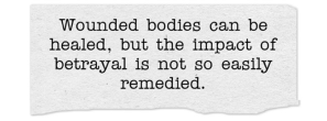 • As usual, J.D., your transparent, personal input grabs the heart and reminds all of us that the betrayals going on all around us are not as significant as the physical violence, but that’s another one of Satan’s lies. As you have pointed out with such clarity, the wounds of betrayal go are real and deeply painful. God bless you for once again reinforcing and enlightening God’s Word. You are one of God’s courageous and gifted emissaries, and one with whom I’m blessed and honored to serve alongside.