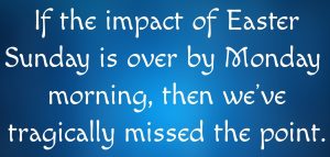 memorializes the day when light and hope finally got to reign supreme over darkness and despair. That Sunday morning we call “Easter” was, indeed, a day quite unlike any other, and our response to it should also be quite unlike our response to any other. In light of that, we might suggest that if the impact of Easter Sunday is over by Monday morning, then we’ve tragically missed the point.