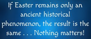 the power of Jesus’ resurrection somehow reached out to include individual folks like you and me. Paul said that if Christ was not risen, nothing matters! And … I might add that if Easter remains only an ancient historical phenomenon that doesn’t include you and me, the result is the same . . . Nothing matters!