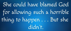 anything else on earth, and there was nothing she could do to prevent it. Taking Him away seemed more unfair and cruel than anything she could imagine – and she could have responded with anger, even rage at the blatant injustice of it all. She could have blamed God for allowing such a horrible thing to happen or just withdrawn to herself and wallowed in self pity . . . But she didn’t.