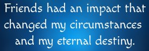 the best choices I ever made. Those friends had an impact on my life that changed my present circumstances and my eternal destiny. There was a day when someone I hadn’t previously known decided to be my friend. I soon learned that my new friend had another friend named Jesus – and along the lines of Pastor Dick’s approach, he thought the two of us should get to know each other . . .